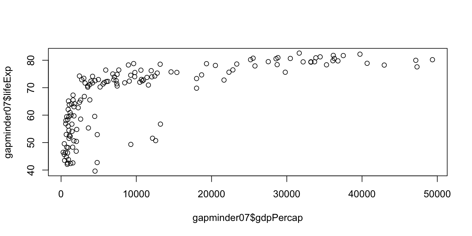plot(gapminder07$lifeExp ~ gapminder07$gdpPercap,