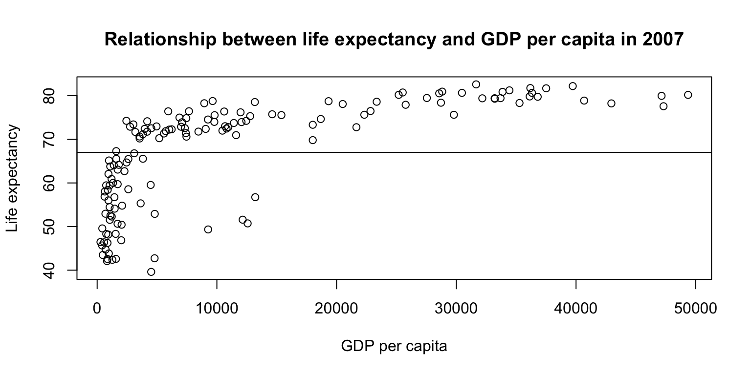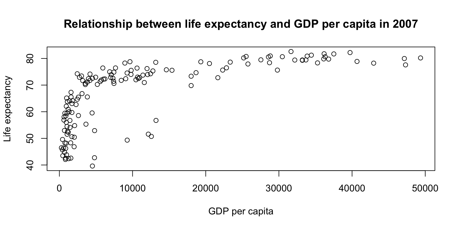 main="Relationship between life expectancy and GDP per capita in 2007",